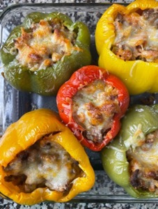 Once the meat mixture is finished and bell peppers have been microwaved, fill each bell pepper with the meat and rice mixture and transfer to a 3-quart baking dish. Sprinkle with cheese and bake for 20 minutes or until cheese is browned and bell peppers are tender.